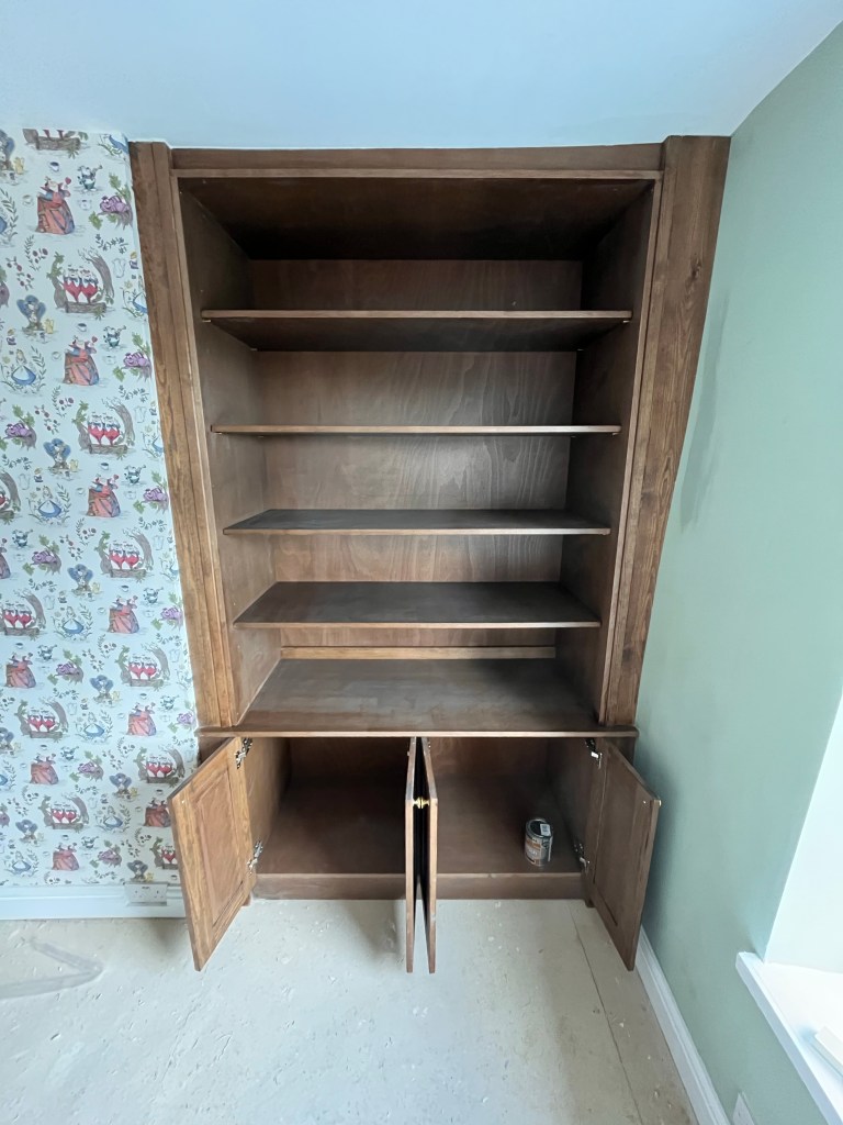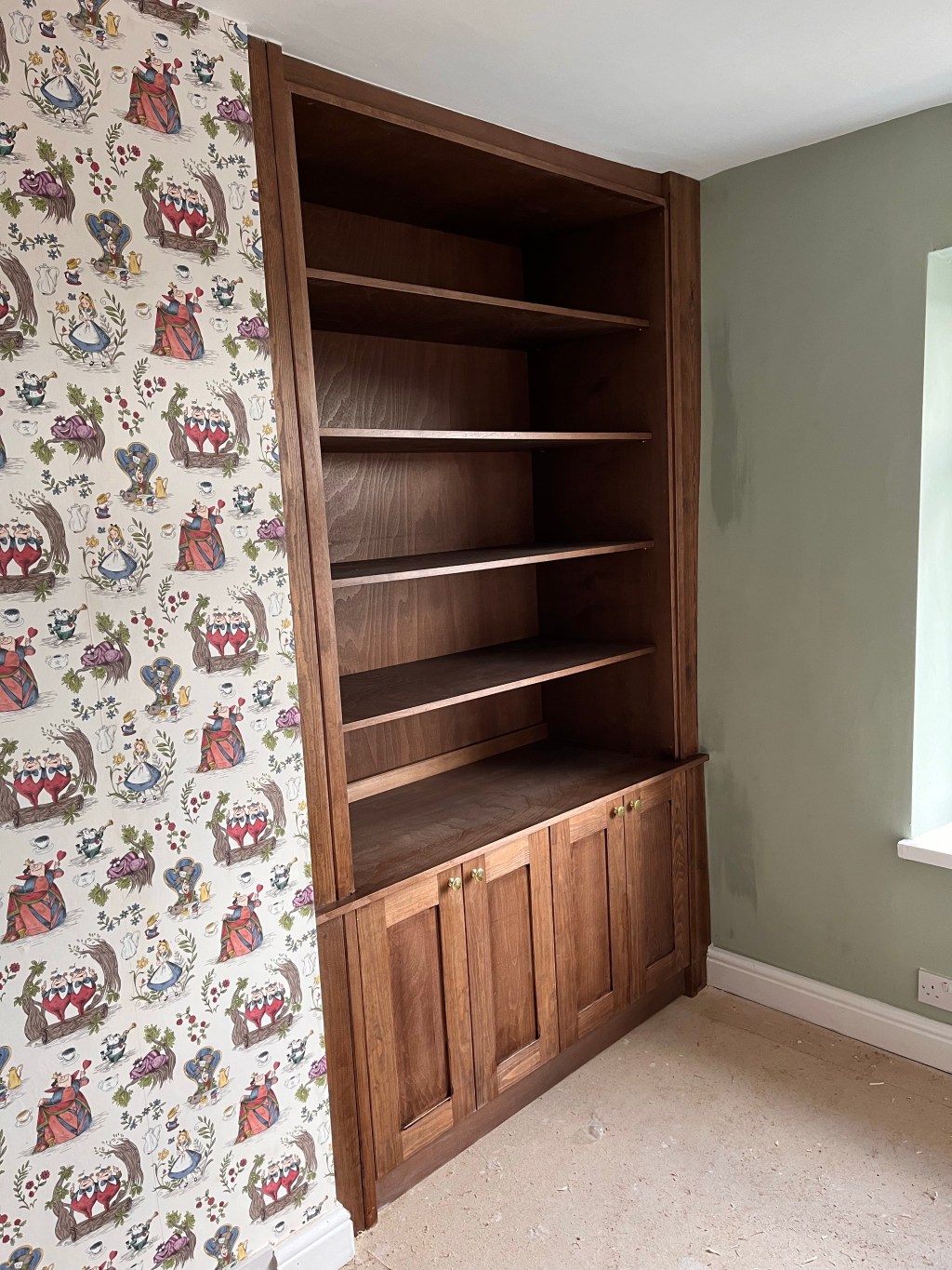 Part office and part wardrobe over spill the larger of the two alcoves became a bookcase and cabinets as an office during the day (ready with desk height cabinets to act as an extension) and a wardrobe in the smaller alcove to keep those rarely used items of clothing tidy and ready for when they’re needed.